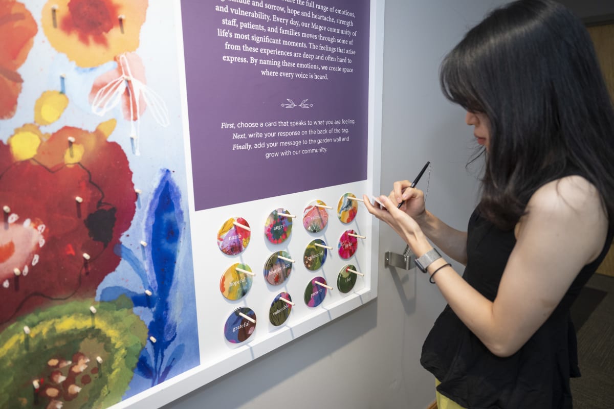 A community art wall that invites participation through anonymous shared emotional expression across the full spectrum of oncology experiences.