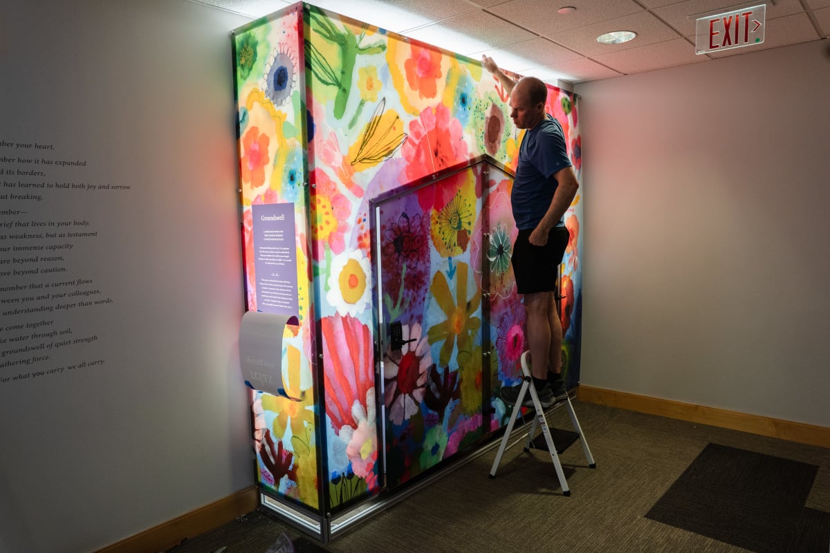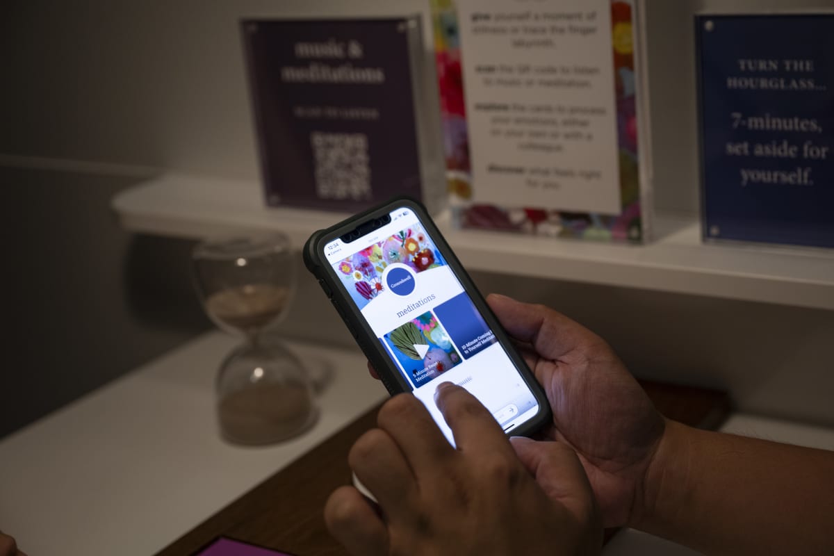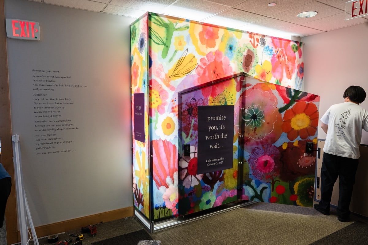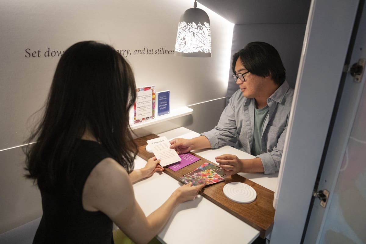 We heard that staff save their tears for the car ride home or the bathroom stall—a process that takes away from their quality time with loved ones. Almost everyone we spoke to commented on the physical environment as an opportunity for improvement. Nestled in a space that once housed telephone booths, the pod invites staff to take a moment to restore, reinforcing the message that emotional labor is real work deserving of real space.