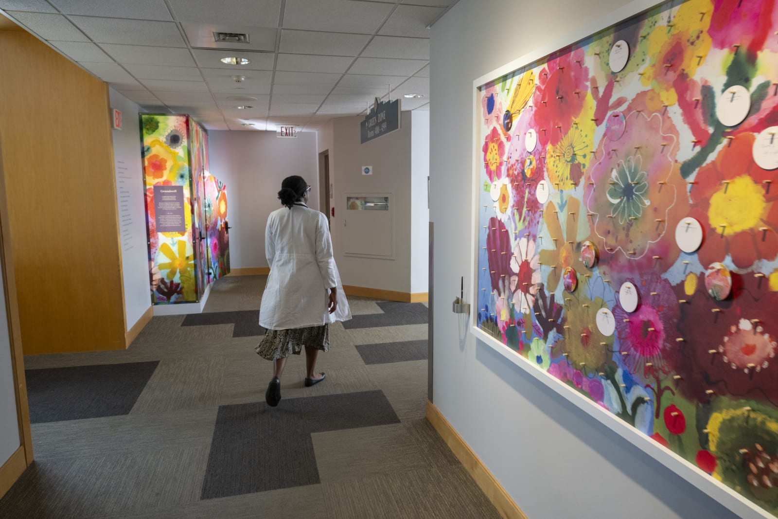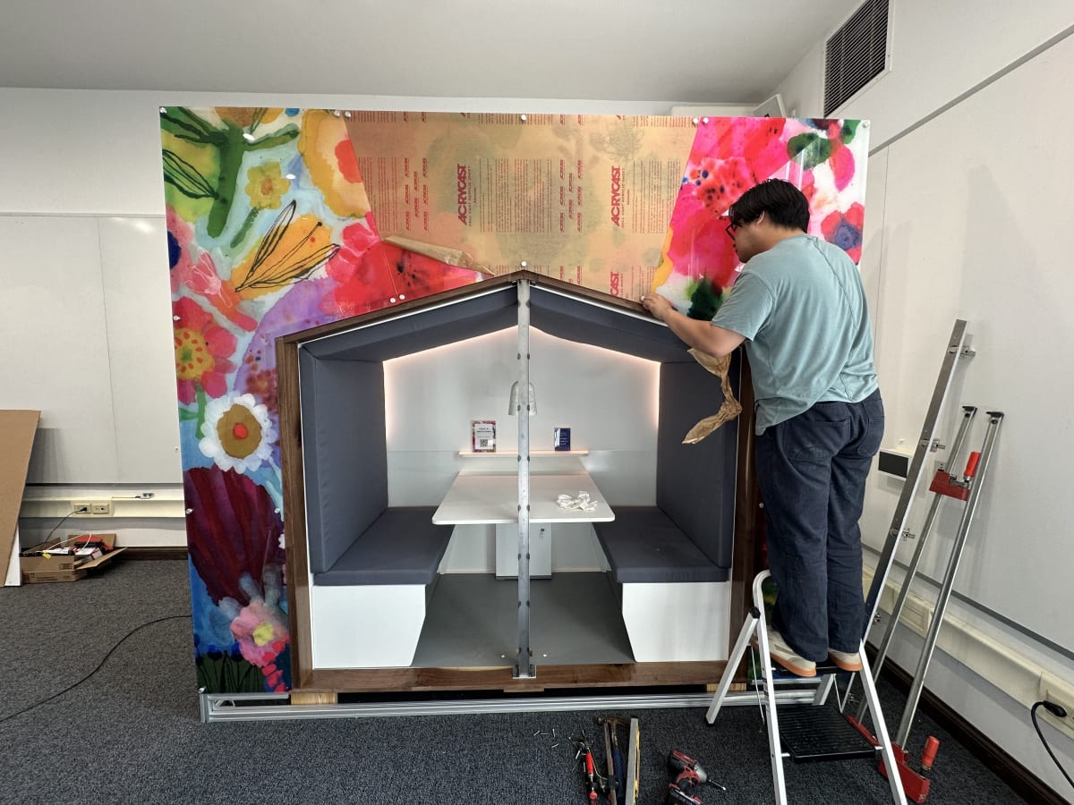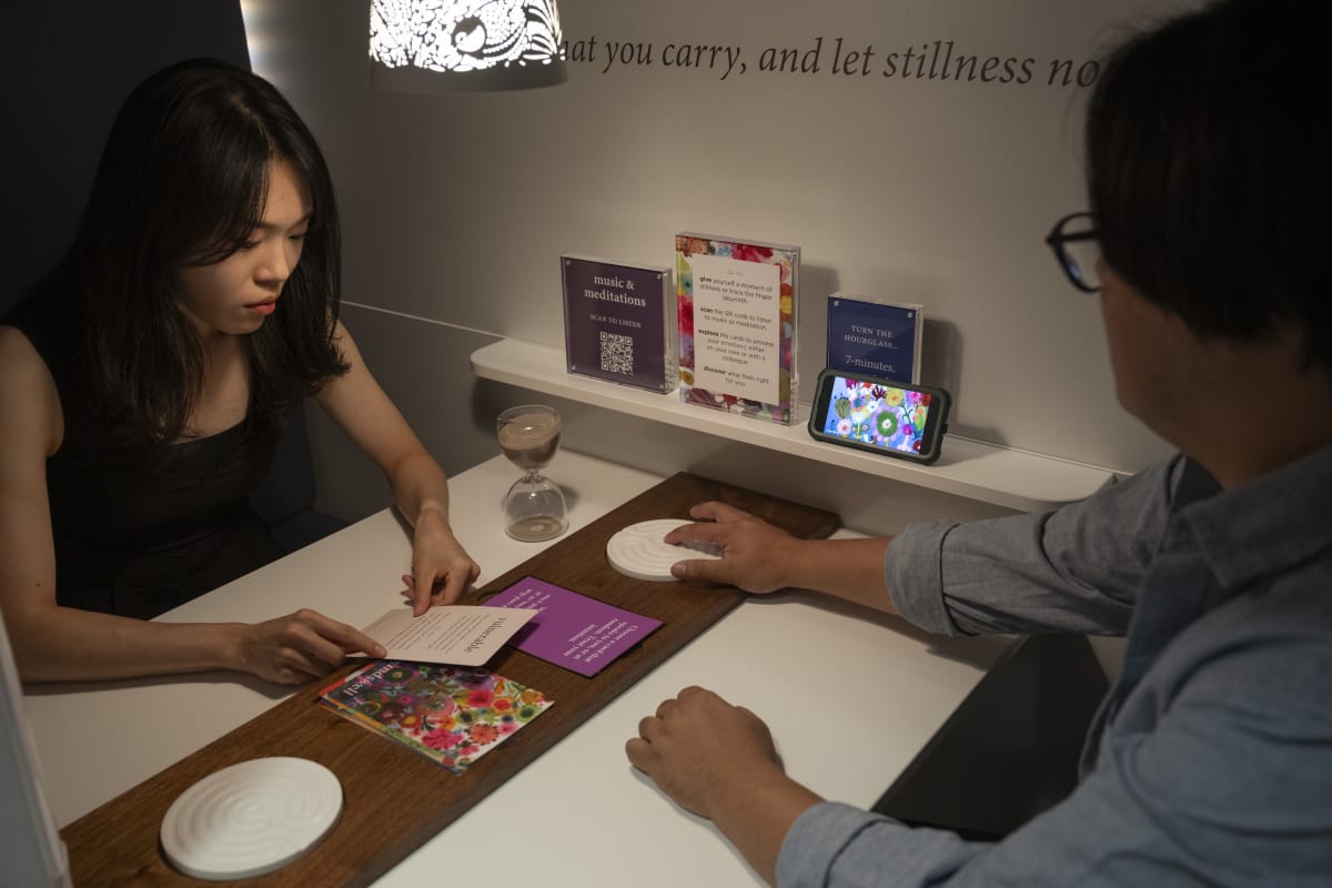 We heard that staff save their tears for the car ride home or the bathroom stall—a process that takes away from their quality time with loved ones. Almost everyone we spoke to commented on the physical environment as an opportunity for improvement. Nestled in a space that once housed telephone booths, the pod invites staff to take a moment to restore, reinforcing the message that emotional labor is real work deserving of real space.