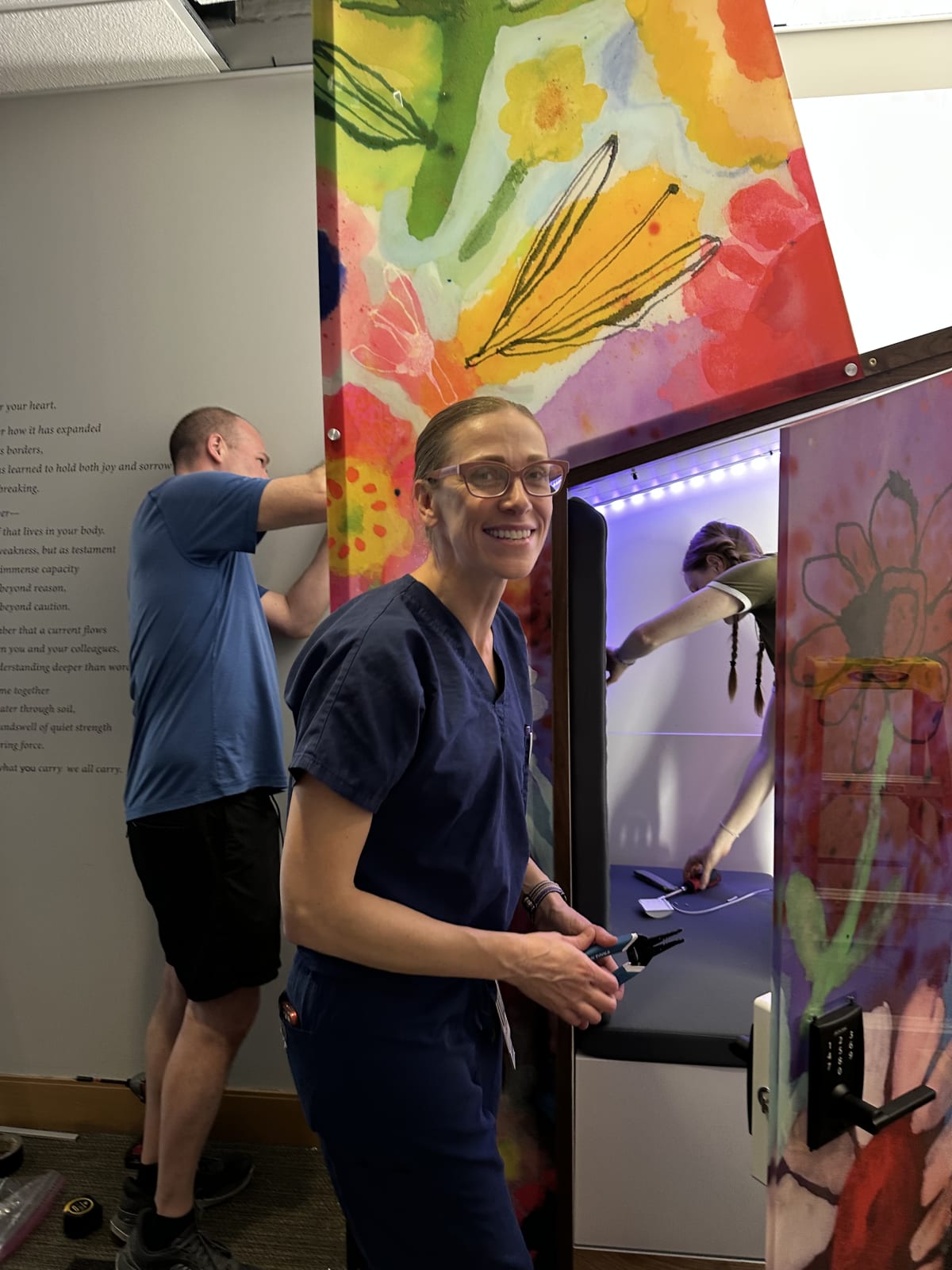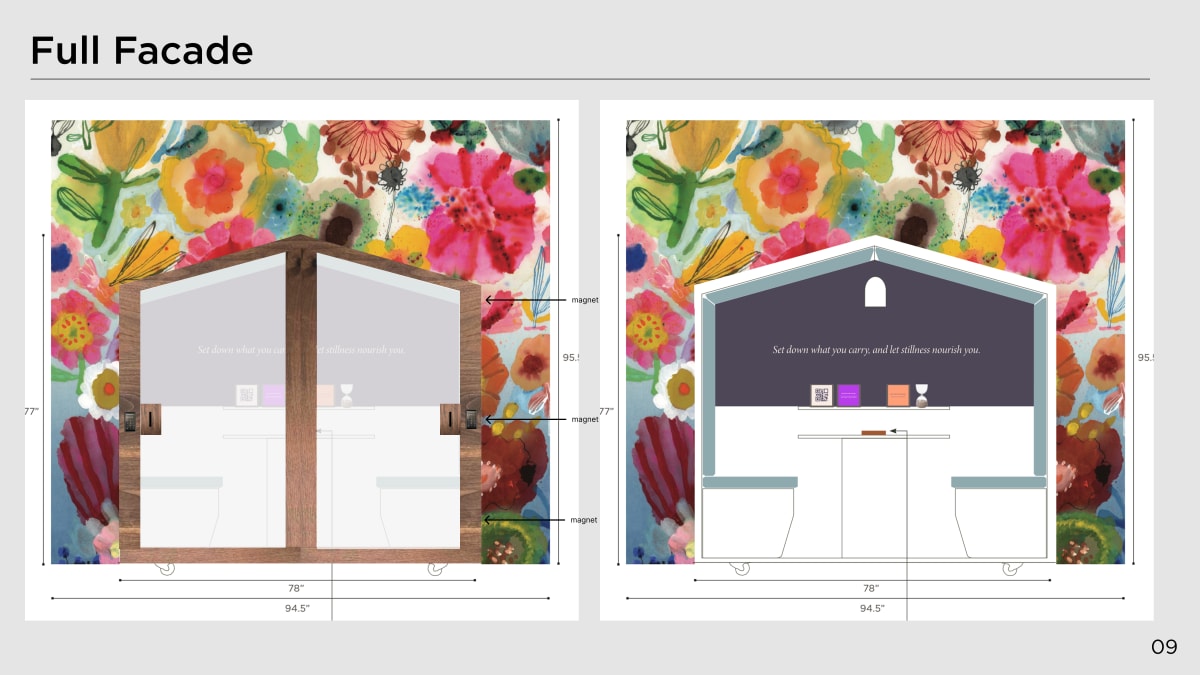 The project required constant adaptation. Early staff feedback shifted our language from “grief” to “restoration,” reframing the messaging. Halfway through production, hospital administration required lockable doors on the pod. Our solution provided engagement, privacy, and emotional safety without surveillance—turning a constraint into an asset.
