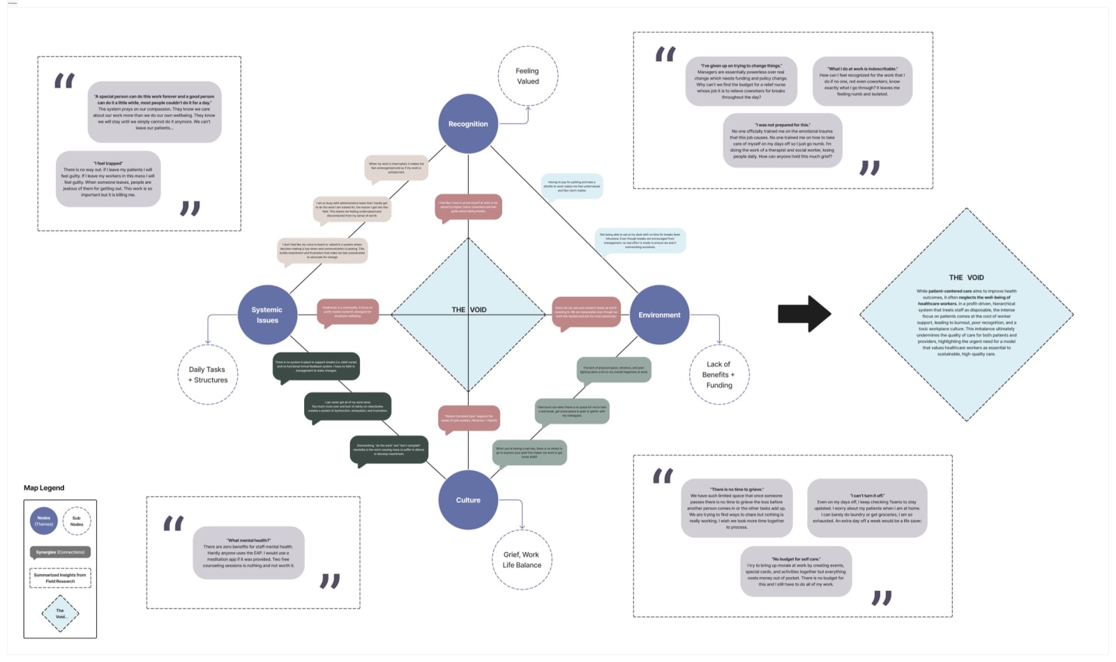 We conducted contextual interviews while shadowing nurses across multiple occasions, observing the windowless environment, the cramped desks, the constant interruptions. We also held an in-depth interview with a former employee who could speak freely about the culture without fear of professional consequences.