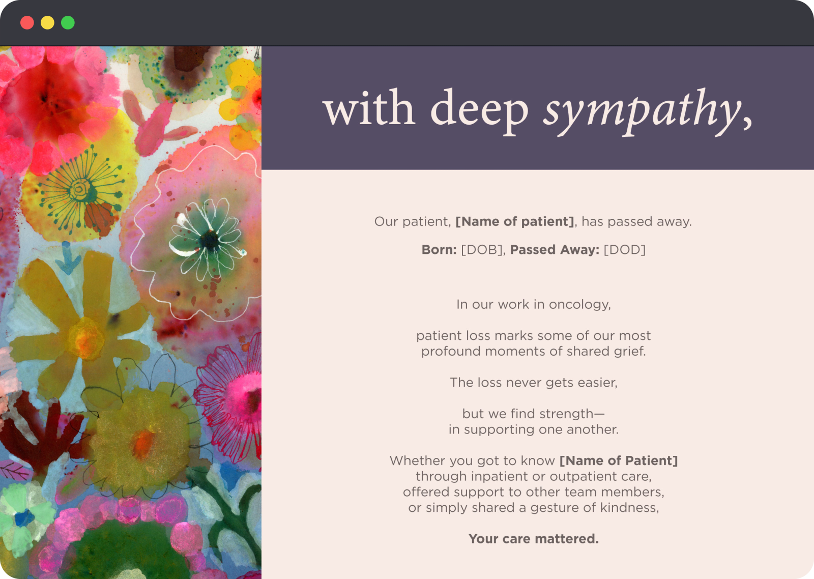 Updated patient death notification email template with compassionate visuals and language that acknowledges the impact of patient loss.