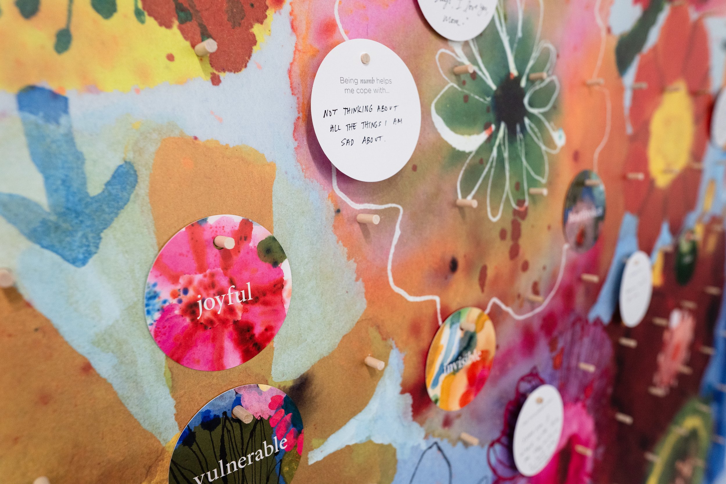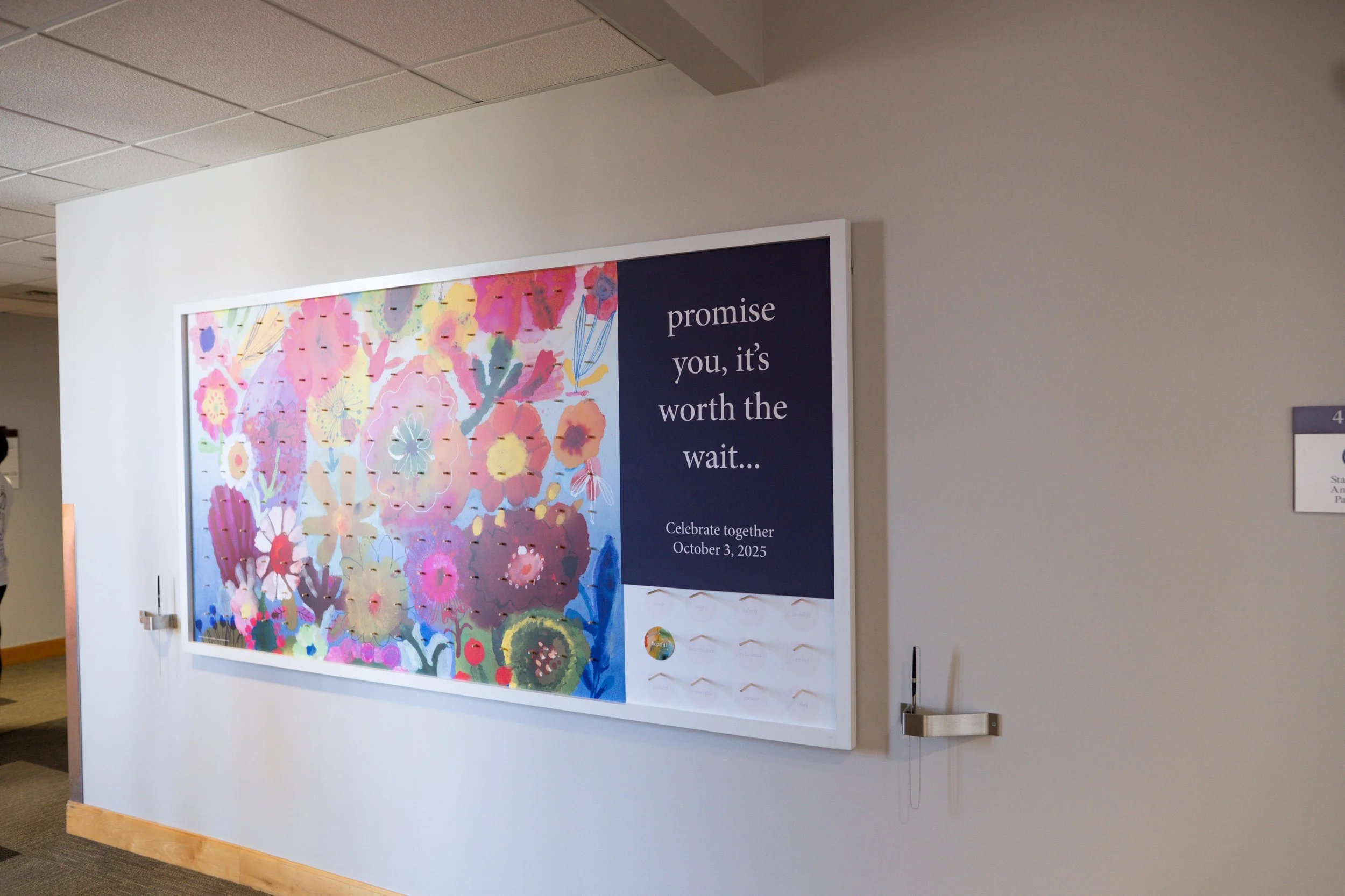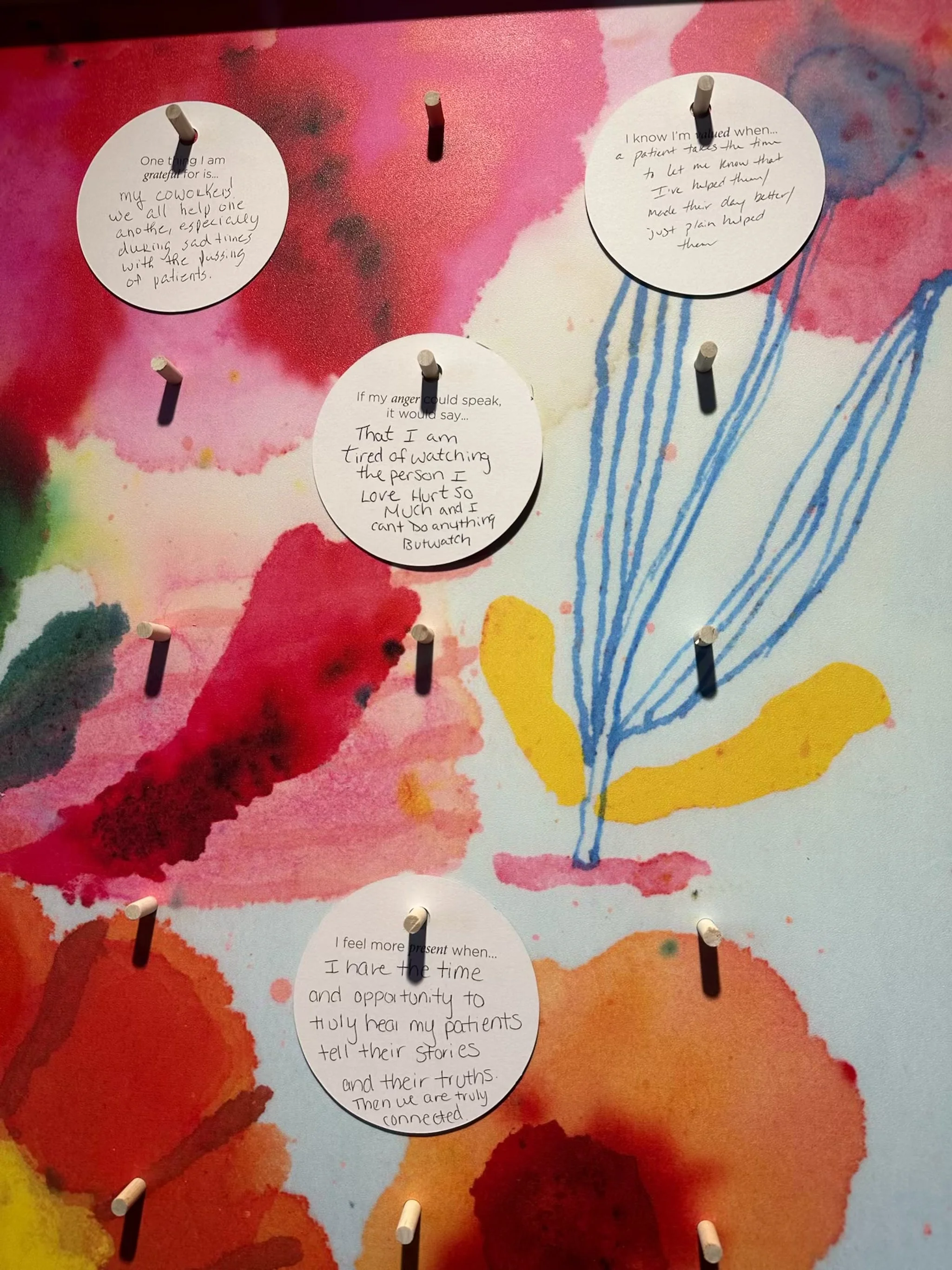 Community art wall that invites participation through anonymous shared emotional expression across the full spectrum of oncology experiences. By recognizing patient care as an interconnected ecosystem rather than isolated individual transactions, the wall acknowledges shared emotional labor among all team members—from clinical staff to administrative personnel to family caregivers.