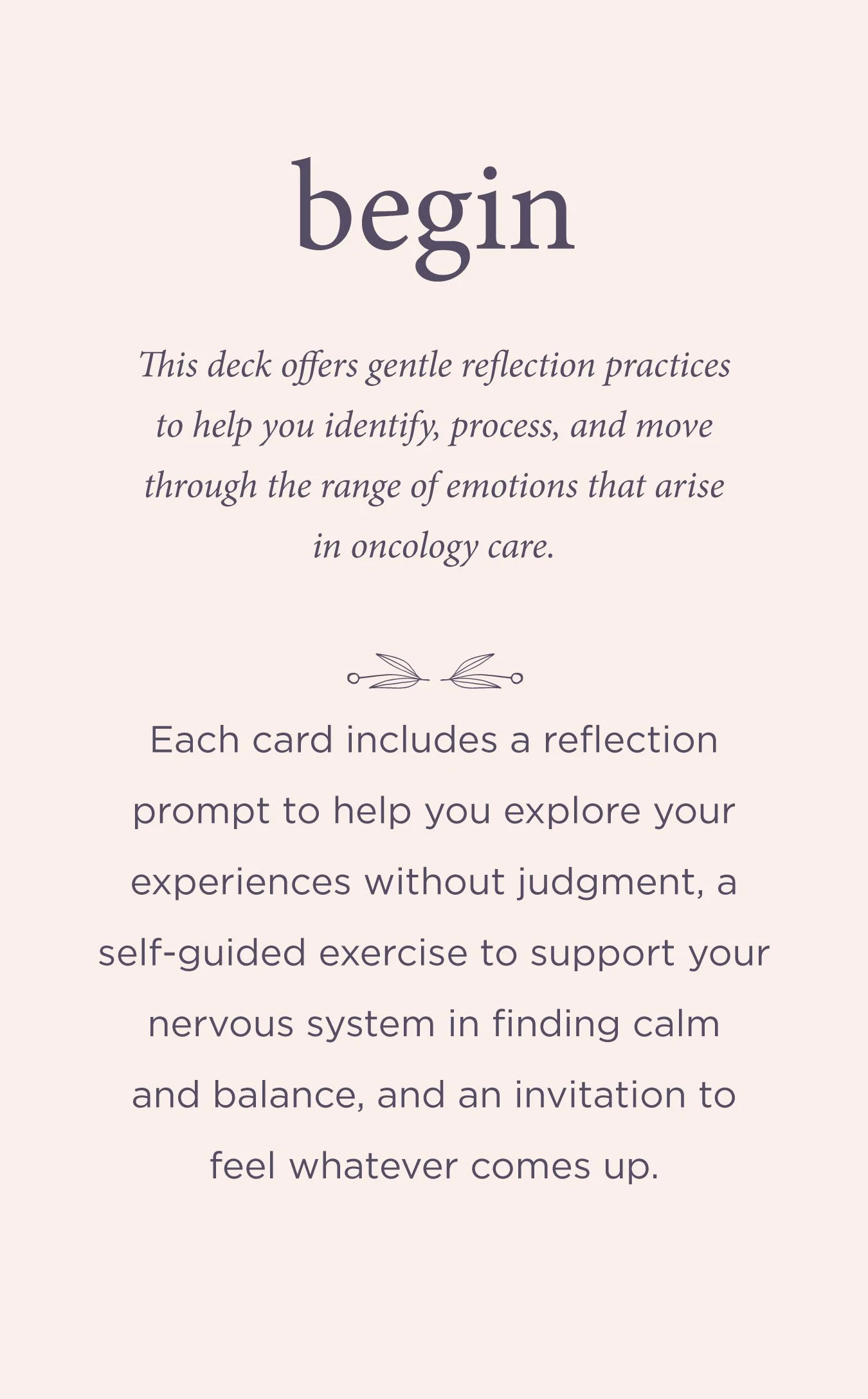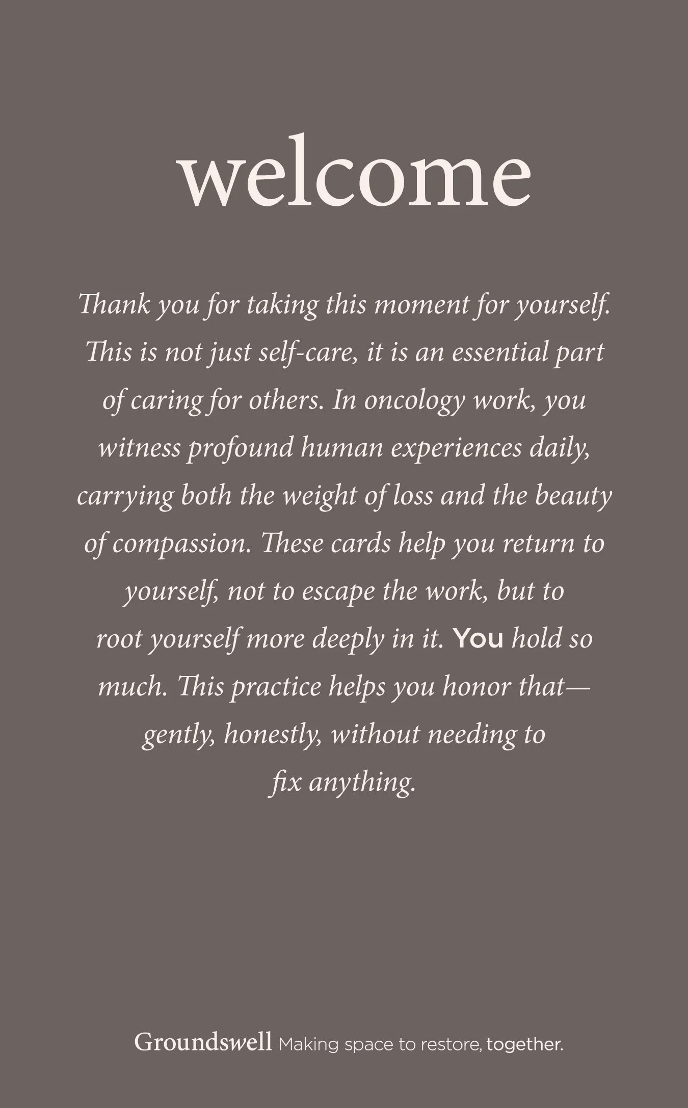 Guided reflection cards that help staff build a self-care practice through emotional validation and introductory exercises for emotional regulation. These cards integrate mind-body approaches to processing the complex, contradictory emotions inherent in oncology work, helping staff cultivate the capacity that is essential for sustained compassionate care.