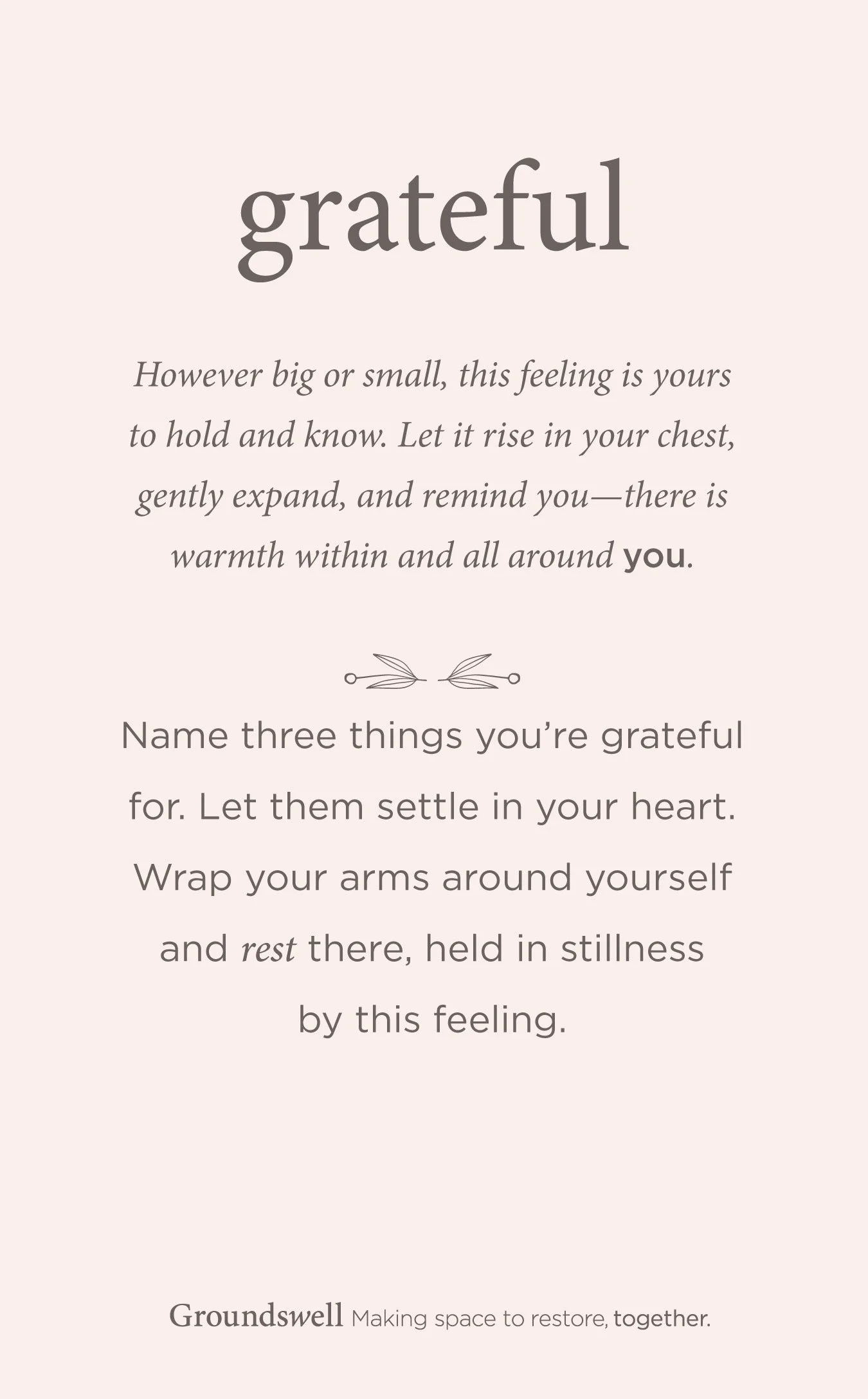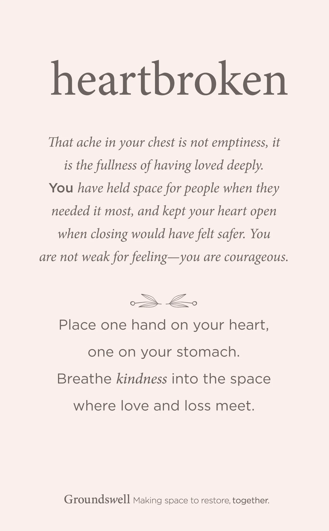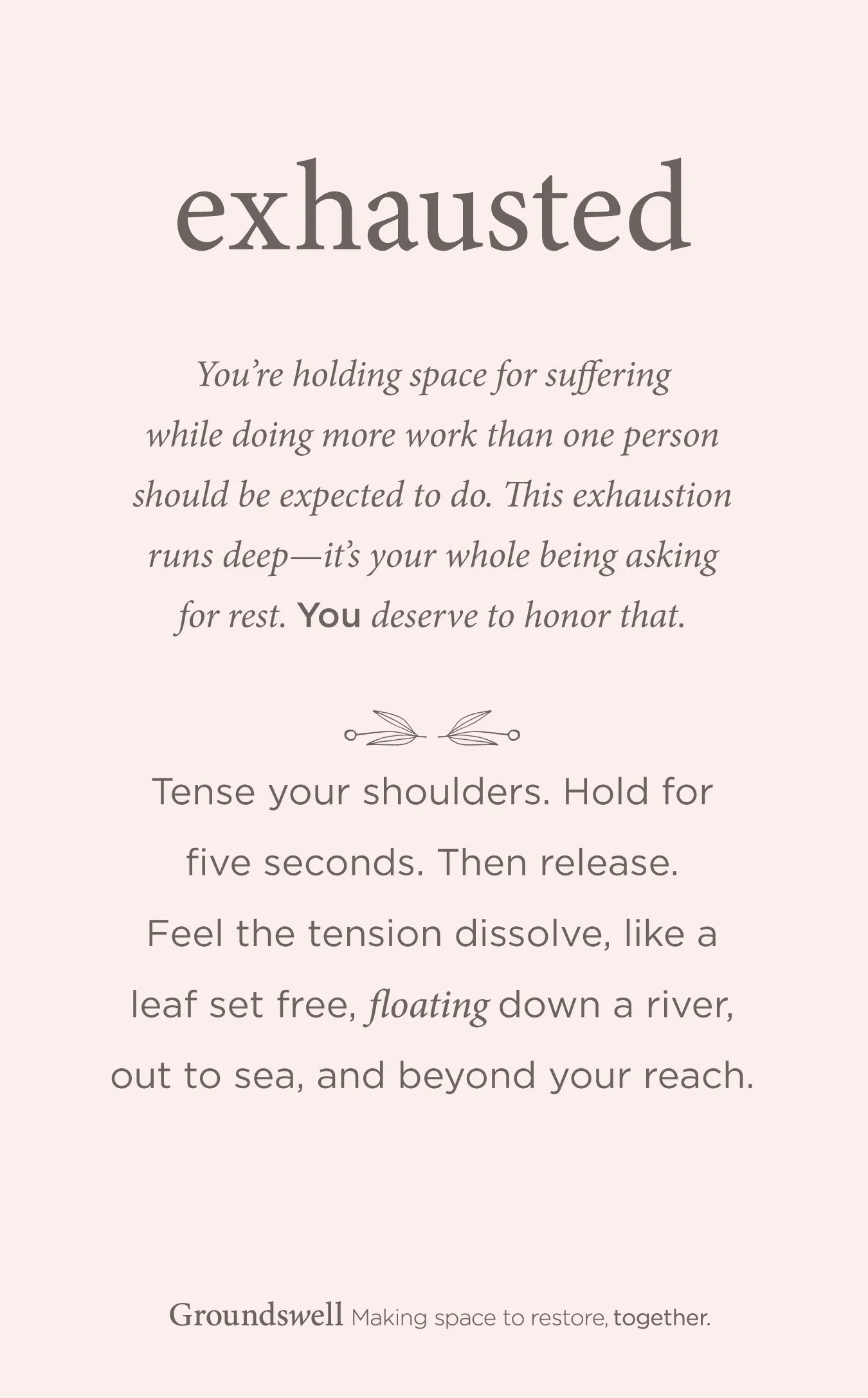 This resource is a significant piece of the equation. Every staff member received their own deck of cards to use as they see fit and one set permanently lives in the restorative pod. By showing healthcare workers that the full spectrum of grief includes complex and contradictory emotions, we help create a more holistic culture of care. The combination of emotional identification, validation, and somatic exercises make this a powerful tool for processing, facilitation, and connection with self and others.