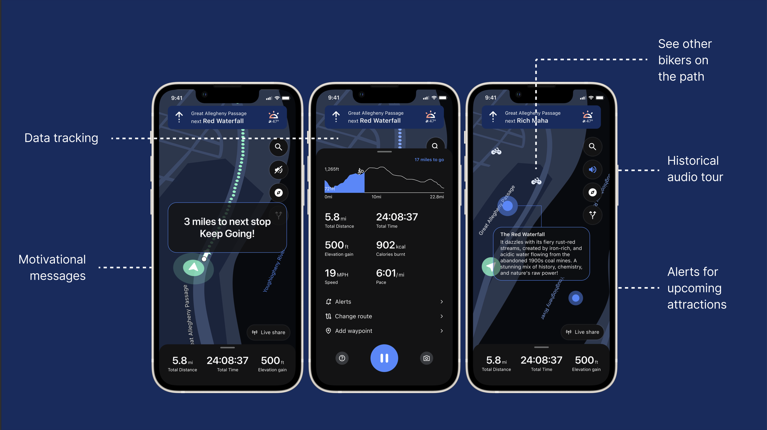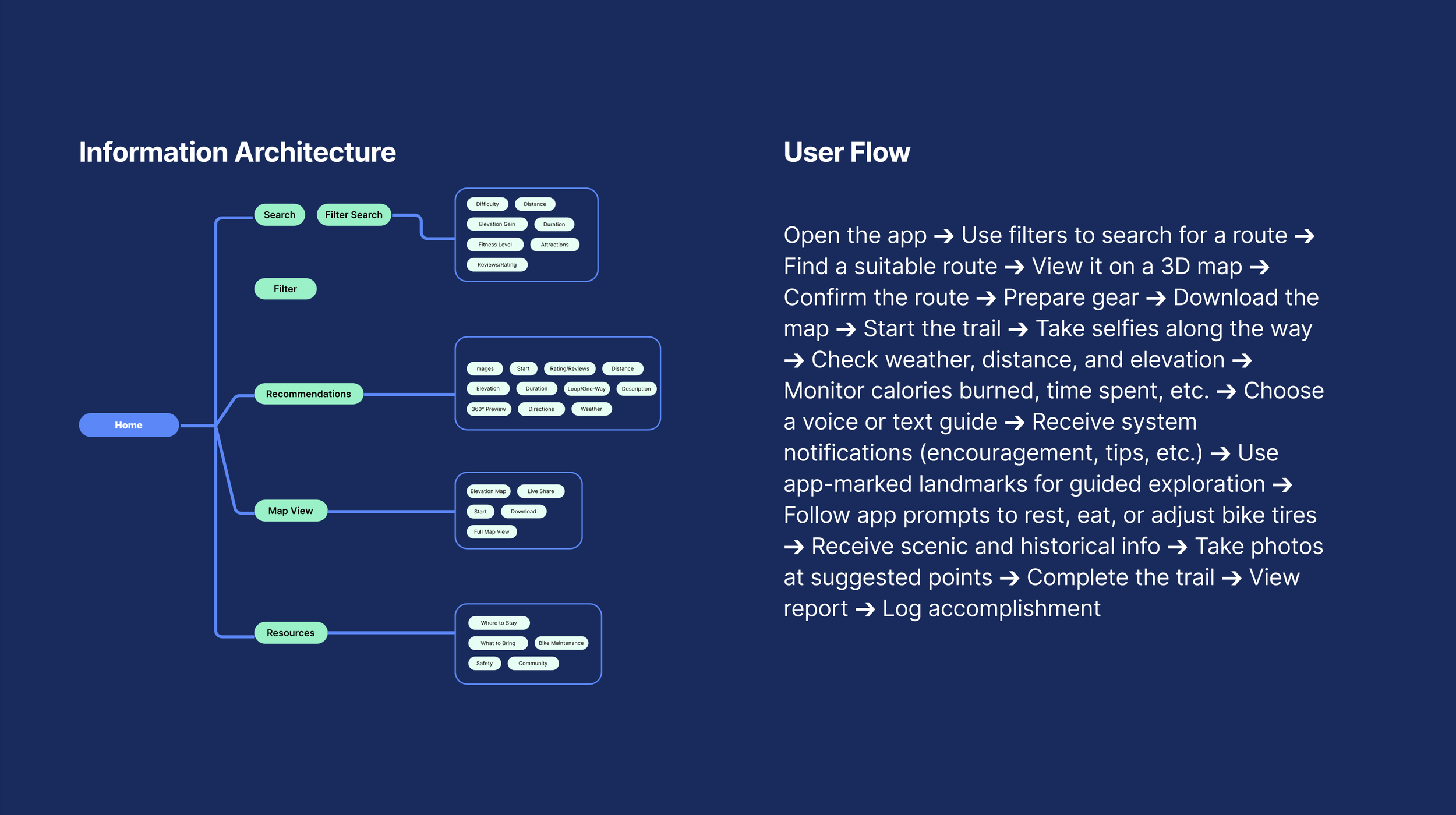 We developed personas and mapped out their journeys while planning a bike tour to identify key pain points and opportunities for our deliverables to be positive interventions. We translated the most important pain points into key deliverables that would serve our user’s needs at every stage of their journey.