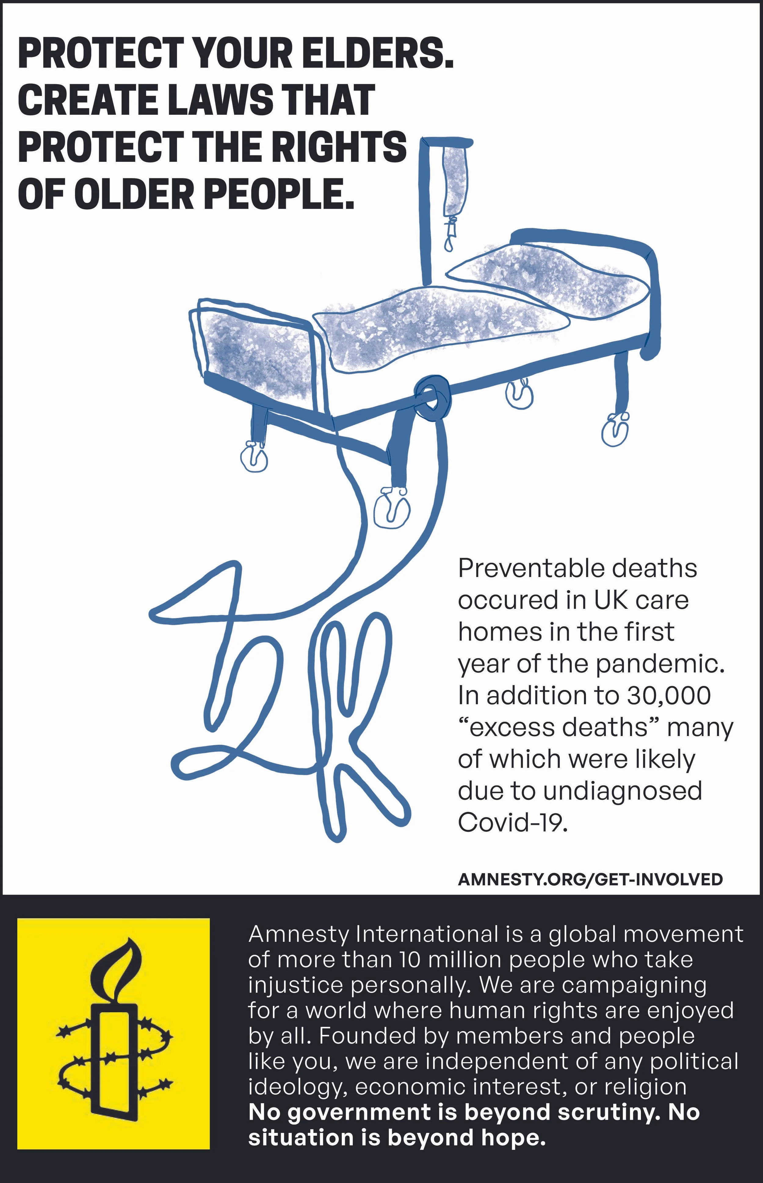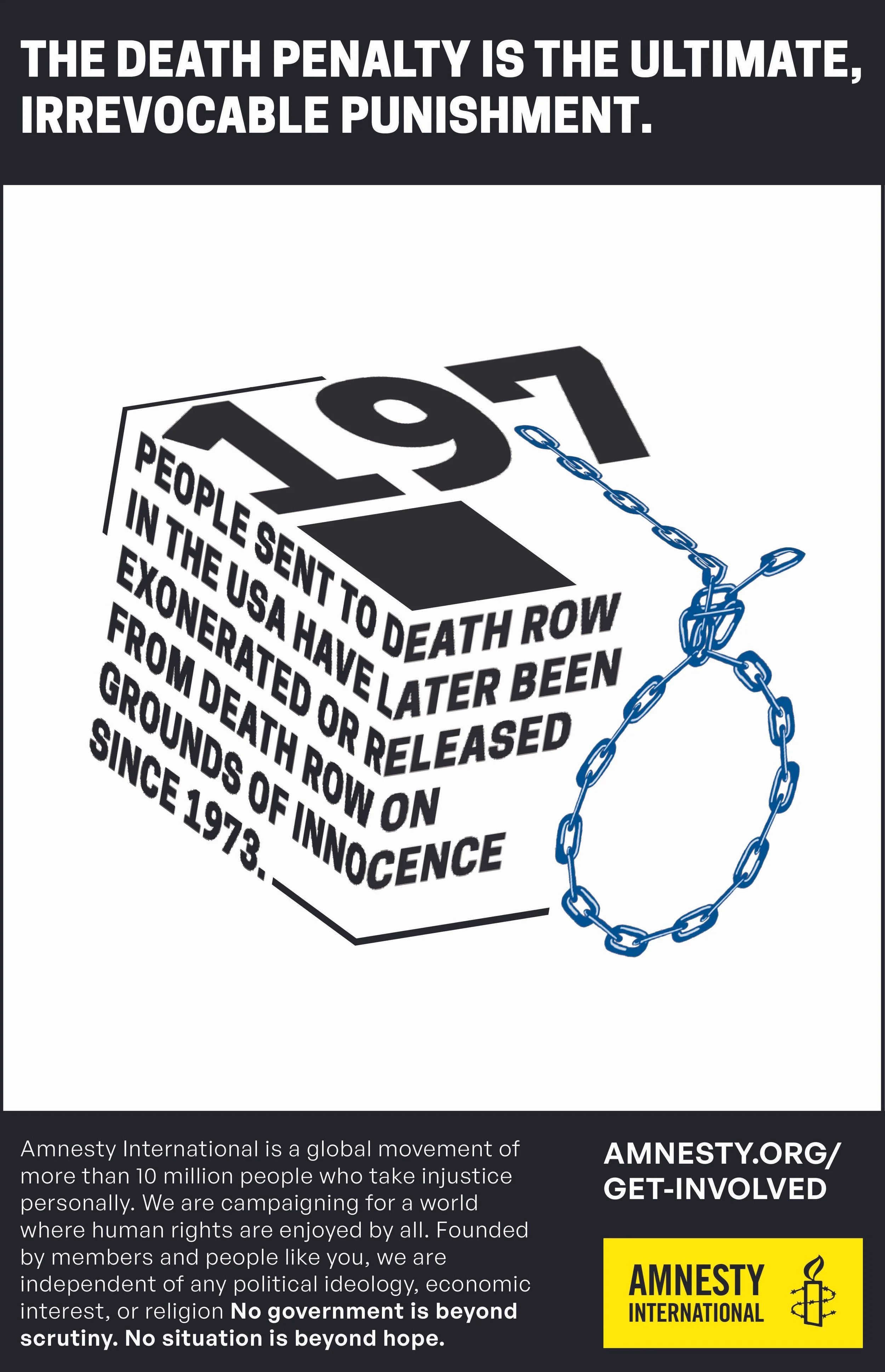 Design a series of three posters communicating Amnesty International’s mission and core issue areas to inspire public engagement. Each poster should address a different topic while maintaining cohesive visual language.